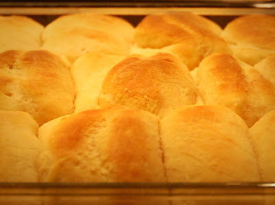 With flour on your hands pull off a portion of dough and roll approximately 3/8-1/2" thick with a rolling pin or a cylindrical drinking glass. With a biscuit cutter or the opening of of a drinking glass cut out as many circles that you can (my uncle Merritt cuts them into squares... he's very efficient, but I have not tried it that way). Dip the bottom half of the circle of dough in the melted butter and place in the pan buttered side down and fold the unbuttered half on top (I just brush butter between the layers as I fold them over). Transfer the unused dough from counter top to a plate to wait. Repeat until you have filled the pan with rolls. Brush the tops with butter and cover to let rise until they are the size you want your dinner rolls to be (it's disappointing if your in a hurry and put them in too soon hoping they'll rise a little more while they're in the oven).